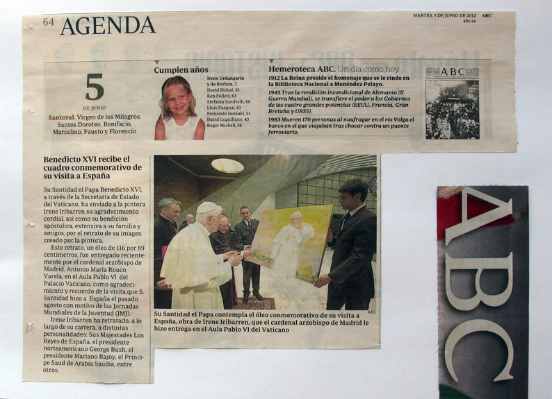 El 5 de junio de 2012, el diario ABC publica en Agenda (Pag. 64) una cronica referente al Viajede Su Santidad a nuestro pais, y el retrato realizado por Irene Iribarren.